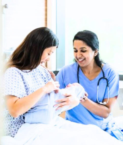 The care continues after childbirth with a focus on maternal recovery and newborn health.